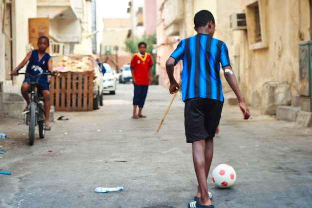 بعض الأطفال يلعبون الرياضة المفضلة في السعودية في أحد الزقاق الضيقة بالحارة
