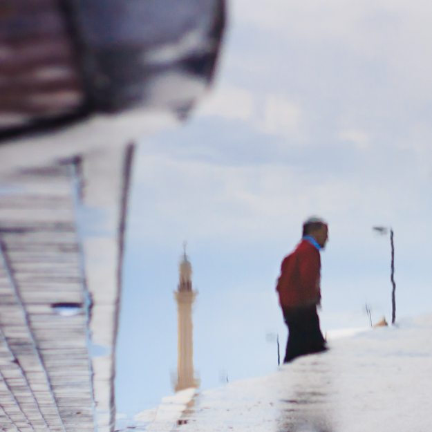 انعكاس قميص أحمر مع جزء من منارة المسجد
