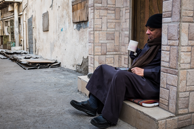 أحد السكان لهذه المنطقة القديمة، رجل سعودي مسن يشرب الشاي في مساءه المعتاد بجانب منزله