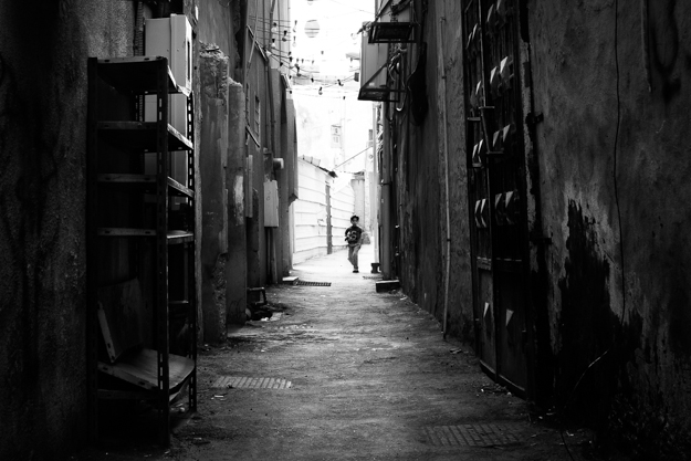One of the locals walking inside between the building