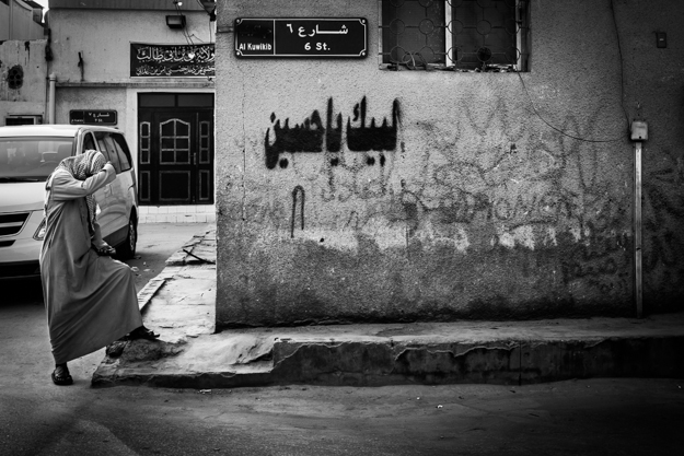 Saudi man is waiting for someone, and the sign show the number of the street and the area name