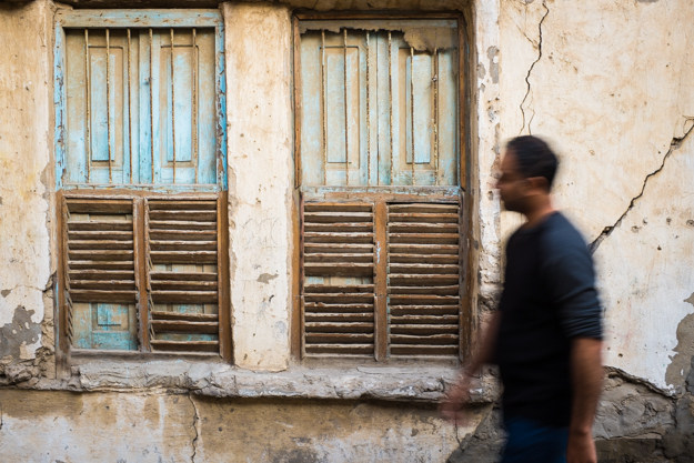 رجل يمشي مروراً بهذه النوافذ القديمة