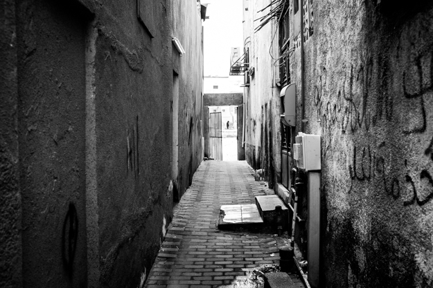 An old woman is getting inside her house in this alley