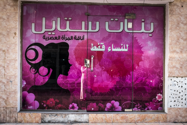 اذا مشيت بالشارع عادة سترى الكثير من المحلات مع واجهات زجاجية تستطيع الرؤية من خلالها، لكن المشغل النسائي دائما دائما تكون محجوبة وهذا فقط مثال ونعم هذا موجود بالشارع