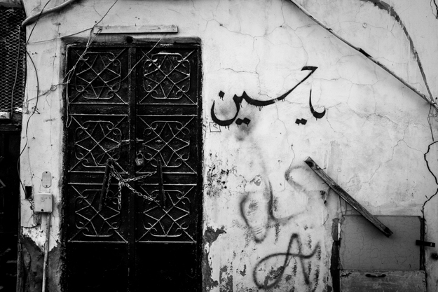 باب قديم مغلق ومكتوب بجانبه – يا حسين