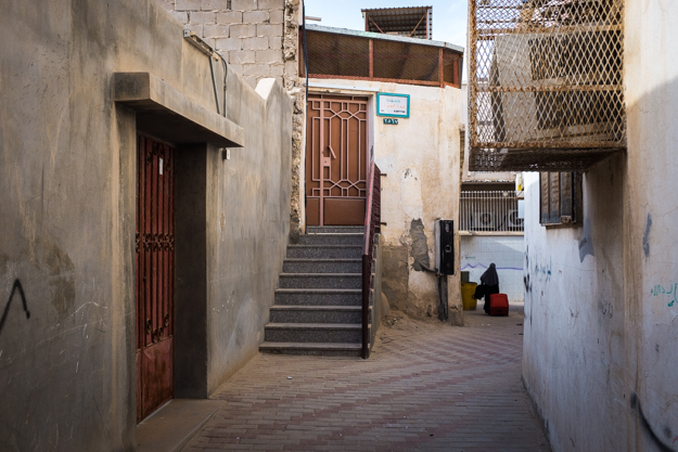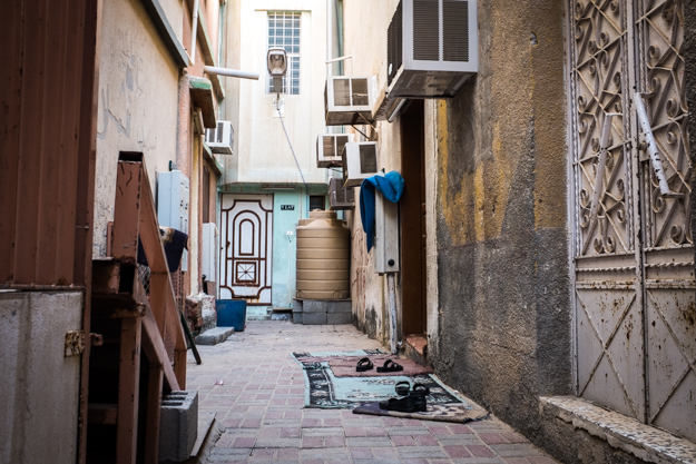 هذا مشهد غير متوقع، في هذا الممر الضيق البيت الذي على اليمين لديه بعض الضيوف ( من النساء طبعاً ) وقد قاموا بترك أحذيتهم بالخارج بسبب أنه لا يوجد مكان لوضعها بالداخل