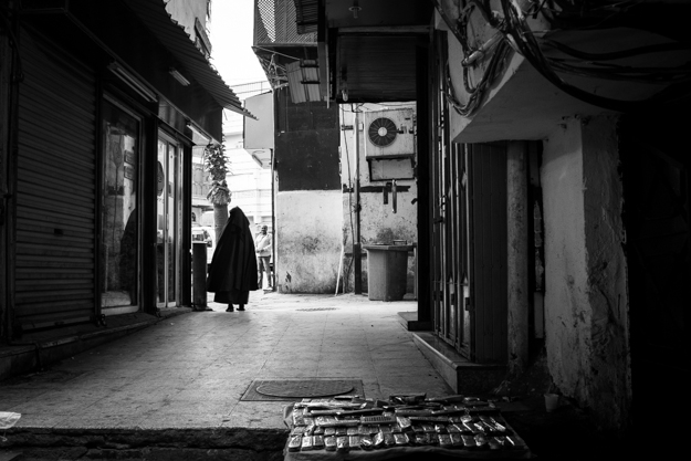 امرأة تغادر السوق من هذا الزقاق