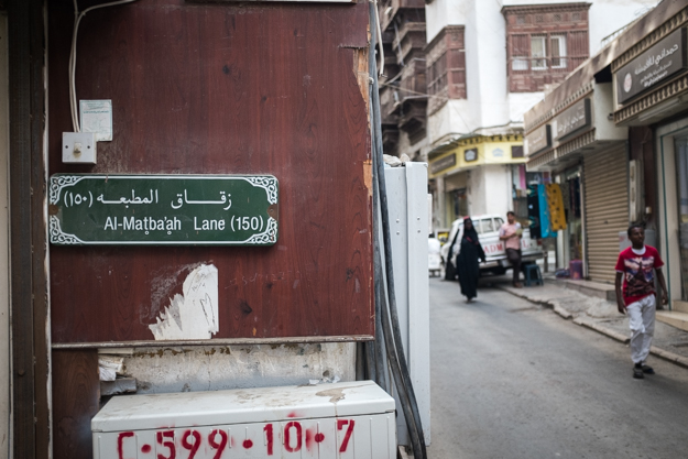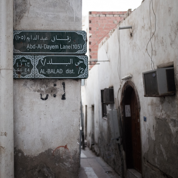 Sign that marks the name for this area ” Al-Balad Dist. ” and for the name of this alley. This is a new sign design