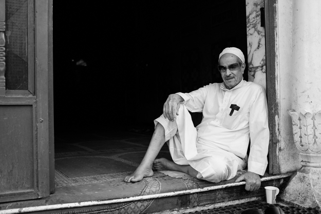 يجلس على باب المسجد، يبتسم للأشخاص الذي يمشون بالقرب منه على الرصيف، مجرد يوم اعتيادي