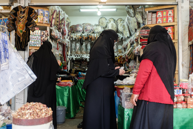 نساء أمام أحد المحلات والتي تبيع المصنوعات اليدوية