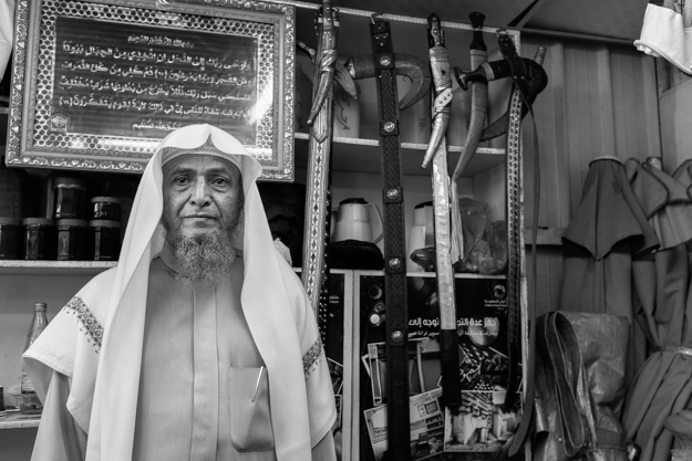 ذهبت إلى داخل احد المحلات ولاحظت هذه الخناجر المعلقة للبيع، طلبت من المالك أن يقف بجانبهم لأنها تمثل جزء من ثقافتهم وتقاليهم في هذه المنطقة