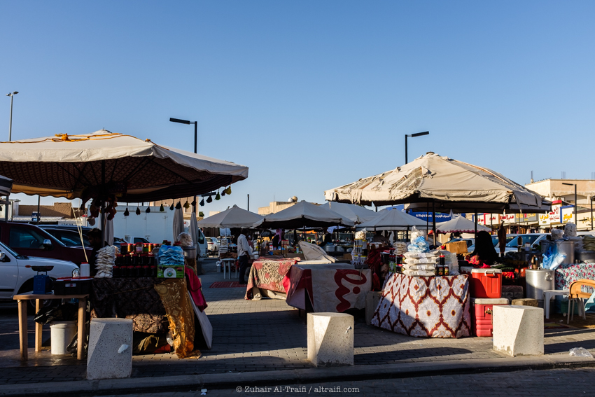 عندما وصولي للسوق كان الوقت لا يزال مبكراً ويصادف وقت صلاة العصر لذا جميع المحلات كانت مغلقة، وهناك المحلات المتخصصة لبيع ما يخص الخيام والتخييم بشكل عام استخدم جزء من الخيام نفسها لتغطية المحلات وقت إغلاقها